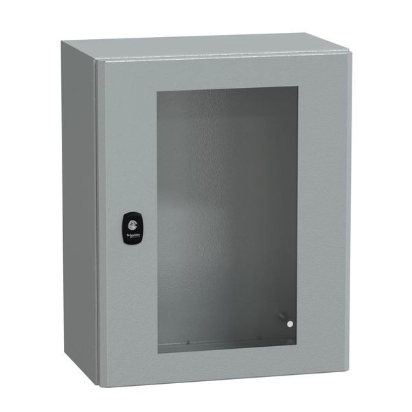 PanelSeT S3D Wandgehäuse aus Stahl mit Sichttür. Einteiliger Körper, ohne Montageplatte. 3-Punkt-Verschlusssystem mit Griff und 3 mm Doppelbartschliessung. Aus Stahl, Epoxid-Polyester-Pulverbeschichtung. Schutzart IP 66, IK08, Farbe RAL 7035. 1 Kabelverschraubungsplatte im Lieferumfang enthalten, Standard.
