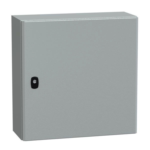 Wandschrank PanelSeT S3D aus Stahlblech mit Montageplatte. Korpus aus einem Stück gefalzt und verschweißt, verstärktes Vorderprofil in zweifacher Blechstärke als Regenrinnenprofil. Bündige Rückseite. IP66, IK10. Leicht aushängbare Tür, schneller Türanschlagwechsel, hervorragende Stabilität durch 20 mm starken Verstärkungsrahmen in doppelter Blechstärke, Türöffnung 120°, 2 oder 3 verdeckt liegende Scharniere. Dreipunktverschlusssystem mit nur einem Betätigungselement ab Bauhöhe 600 mm. Problemloser Gestängeumbau. Max. Belastbarkeit: 50 kg/m2. angefastes Türprofil, plasmaverschweißt, Beschichtung aus Epoxy-Polyester in RAL 7035.
