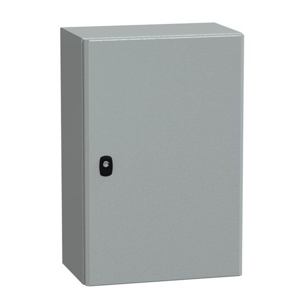 Wandschrank PanelSeT 3D aus Stahlblech, mit Volltür, ohne Montageplatte. 600 x 400 x 250mm. Robuste Konstruktion in neuem Design. Schutzart IP66. Erfüllt EN 50298, IK 10, Korpusfront zweifach gekantet als Regenrinnenprofil, senkrecht angefaste Tür mit Doppelfalz. Polyurethan-Dichtung und Tür mit Doppelfalz. Drei-Punktverschlusssystem ab Bauhöhe 600 mm. Kreuzfalzung, korrosionsbeständig: plasmaverschweißtes Stahlblech, pulverbeschichtet in RAL 7035. Umfangreiches Zubehörangebot. Verpackung nach erfolgter Bestückung wiederverwendbar.