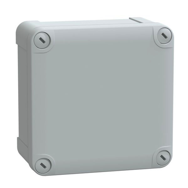 PanelSeT TBP Industrie-PC-Box mit Deckel H10. Innenmaße 105 x 105 x 105 x 55 mm. Ext 116 x 116 x 62 mm. Wandmontagegehäuse mit flachem Deckel. Schraubenverriegelung mit unverlierbaren Kunststoffschrauben (Schlitz). Zertifizierungen DEMKO, SEMKO, TÜV, UL. UL 508 A Standard. Feuerbeständigkeit 960°. Polycarbonat, Umgebungstemperatur für Lagerung/Betrieb (-15 bis 60 °C)/(-25 bis 80 °C). IP66 (NEMA 4.4X), IK08, Grau RAL 7035, Isolationsklasse II. Verpackungseinheit 5 Stk.
