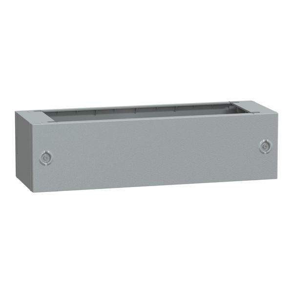 Sockel für PanelSeT PLA. Frontale Öffnung. Zubehör für Mehrzweck-Gehäuse. Befestigungsart durch Schrauben an der Seitenteilposition. Oberfläche aus Epoxid-Polyester-Pulver. Sockel: Grau RAL 7035.