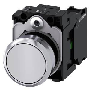 Drucktaster, 22 mm, rund, Metall, hochglanz, weiß, Druckknopf, flach, tastend, 1S, Schraubanschluss Drucktaster SIRIUS ACT zur Schaltung und Steuerung elektrischer Verbraucher. Unter dem Markennamen SIRIUS ACT bietet Siemens ein einzigartiges Portfolio an Befehls- und Meldegeräten mit weltweiten Produkt-Zulassungen in drei modernen Designreihen aus robustem Echtmetall und hochwertigem Kunststoff. Das innovative Aufschnappkonzept vereinfacht die Montage so weit, dass dafür nur eine Hand und kein Spezialwerkzeug erforderlich ist. Als Montagebohrungen genügen nutfreie Löcher, da bereits ein 100%iger Verdrehschutz integriert ist. Dank der durchgängig hohen Schutzart sind die robusten Geräte industrietauglich und für den Außeneinsatz geeignet. Sogar die Reinigung mit Hochdruckstrahl ist möglich. Weder Staub, Öle noch aggressive Laugen können den zuverlässigen Betrieb stören. Neben der Standardverdrahtung können die meisten Geräte auch über PROFINET, AS-Interface oder IO-Link an die Steuerung angebunden werden. Damit reduzieren Sie Ihren Verdrahtungsaufwand, minimieren Fehlerquellen und gewinnen mehr Flexibilität. Komfortabel unterstützt der grafische Online-Konfigurator bei Auswahl und Bestellung von Einzelgeräten, Gehäusen und Beschriftungen. Umfangreiche Dokumentation (z.B. Handbuch, 3D-Daten, Anschlussdiagramm) ist verfügbar. Lieferbare Ausführungen: mehrere Farben, beleuchtet/unbeleuchtet, mit/ohne Beschriftung, verrastende/tastende Betätigung, verschiedene Druckknopf- und Frontringhöhen. Hinweis: Komplettgerät, Lieferung inklusive Halter und Module. SIRIUS ACT - Performance in Action beim Befehlen und Melden. Einfach montiert, einfach stark, einfach perfekt.