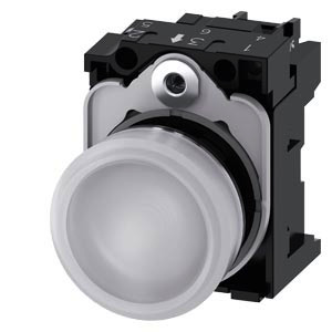 Leuchtmelder, 22 mm, rund, Metall, hochglanz, weiß, Linse, glatt, mit Halter, LED-Modul mit integrierter LED AC/DC 24V, Schraubanschluss Leuchtmelder SIRIUS ACT zur Signalisierung von Schaltzuständen oder Störungen in Anlagen mit brillianter Leuchtkraft dank energieeffizienter LED-Technologie. Unter dem Markennamen SIRIUS ACT bietet Siemens ein einzigartiges Portfolio an Befehls- und Meldegeräten mit weltweiten Produkt-Zulassungen in drei modernen Designreihen aus robustem Echtmetall und hochwertigem Kunststoff. Das innovative Aufschnappkonzept vereinfacht die Montage so weit, dass dafür nur eine Hand und kein Spezialwerkzeug erforderlich ist. Als Montagebohrungen genügen nutfreie Löcher, da bereits ein 100%iger Verdrehschutz integriert ist. Dank der durchgängig hohen Schutzart sind die robusten Geräte industrietauglich und für den Außeneinsatz geeignet. Sogar die Reinigung mit Hochdruckstrahl ist möglich. Weder Staub, Öle noch aggressive Laugen können den zuverlässigen Betrieb stören. Neben der Standardverdrahtung können die meisten Geräte auch über PROFINET, AS-Interface oder IO-Link an die Steuerung angebunden werden. Damit reduzieren Sie Ihren Verdrahtungsaufwand, minimieren Fehlerquellen und gewinnen mehr Flexibilität. Komfortabel unterstützt der grafische Online-Konfigurator bei Auswahl und Bestellung von Einzelgeräten, Gehäusen und Beschriftungen. Umfangreiche Dokumentation (z.B. Handbuch, 3D-Daten, Anschlussdiagramm) ist verfügbar. Lieferbare Ausführungen: mehrere Farben, verschiedene Spannungsvarianten. Hinweis: Komplettgerät, Lieferung inklusive Halter und Module. SIRIUS ACT - Performance in Action beim Befehlen und Melden. Einfach montiert, einfach stark, einfach perfekt.