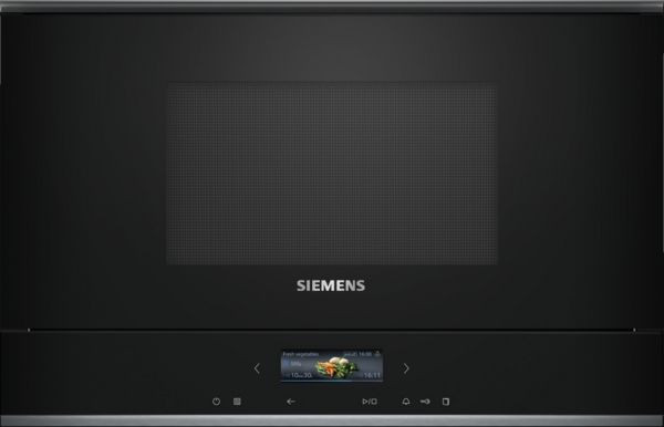 Mikrowelle und Heizart Max. Leistung: 900 W; 5 Mikrowellen-Leistungsstufen: 90 W, 180 W, 360 W, 600 W, 900 W Intelligente Inverter-Technologie: die Maximal-Leistung wird bei längerem Betrieb bis auf 600 W reguliert Grill 1.3 kW Grill mit Mikrowellen-Leistungsstufen 90 W, 180 W, 360 W kombinierbar Design Garraum aus Edelstahl mit Glasboden touchControl-Bedienung Bedienung über Sensortasten Reinigung Selbstreinigende Decken-Beschichtung (Katalyse) humidClean (Reinigungshilfe): Leichte Verschmutzungen entfernen mit Wasserdampf und Spülmittel. Komfort Elektronik-Uhr TFT-Full-Touchdisplay Leicht-Bedien-Konzept: besonders einfaches, problemloses Einstellen cookControl 10 Programme quickStart: Maximale Mikrowellenleistung für 30 Sekunden LED-Innenbeleuchtung Garraumvolumen: 21 l Seitlich öffnende Drehtür, Anschlag links Zubehör Glasschale Rost Umwelt und Sicherheit Sicherheitsabschaltung Starttaste Türkontaktschalter Kühlgebläse Technische Info Länge des Anschlusskabels: 175 cm Gesamtanschlusswert Elektro: 2.05 kW Nennspannung: 220 - 240 V Einbaugerät für 60 cm breiten Oberschrank, Einbau in Hochschränke möglich Maße Gerätemaße (HxBxT): 382 x 594 x 318mm Nischenmaße (HxBxT): 382 mm x 560 mm x 300 mm „Maße und Einbauhinweise zu diesem Gerät gemäß technischer Zeichnung beachten“