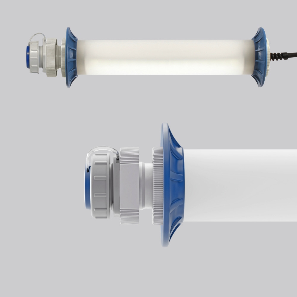 Schutzrohr Kunststoff (Polycarbonat) opal, schlagzäh. Endkappen aus Kunststoff (Polyamid) grau. Protektoren aus weichem Kunststoff an den Enden zum Schutz beim mobilen Einsatz. Homogene, weiche und blendreduzierte Ausleuchtung. Betriebsgerät integriert. Eine Steckdose ermöglicht den Anschluss weiterer Leuchten oder elektrischer Geräte. Schwere Gummischlauchzuleitung H07RN-F für hohe mechanische Belastungen mit Netzstecker. Durch Zubehör (optional) für Wand-, Decken- und Pendelmontage geeignet. Zur Leuchte ist immer ein Montagezubehör mit zu bestellen. Leuchte mit begrenzter Oberflächentemperatur nach DIN EN 60598-2-24.