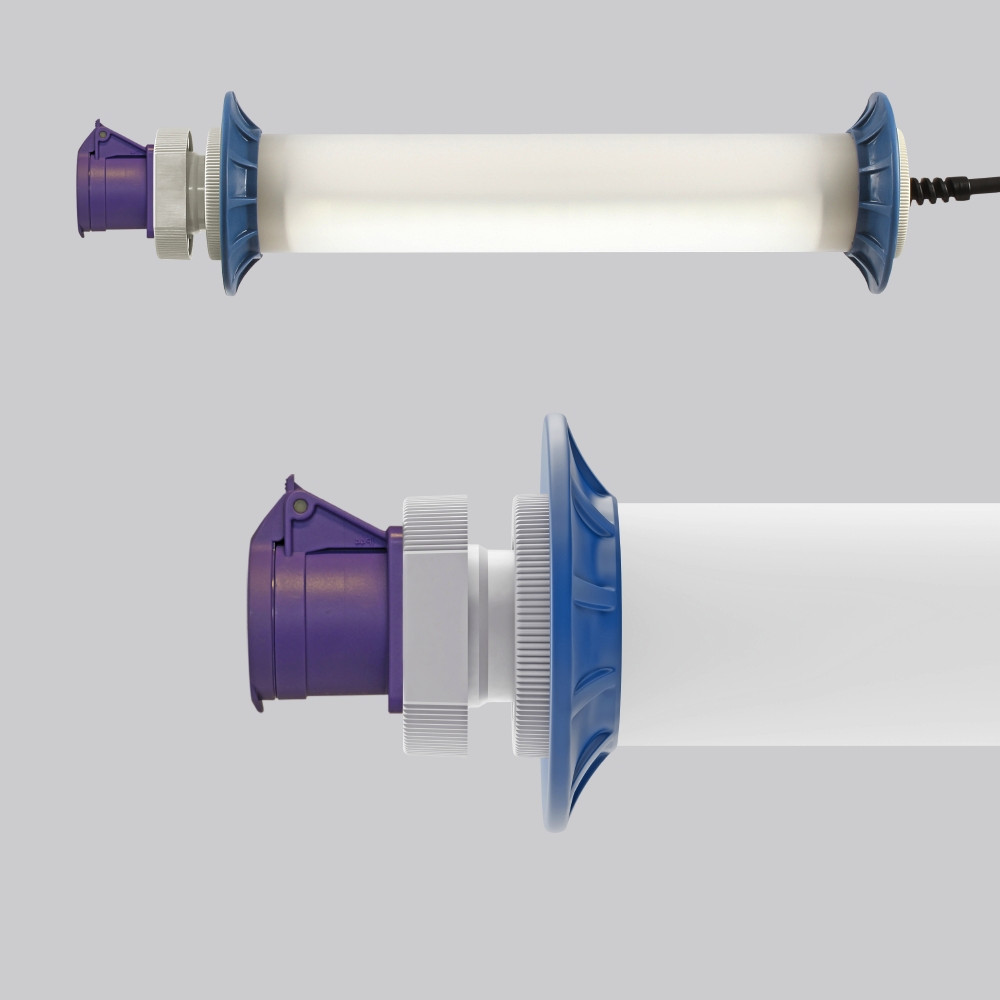 Schutzrohr Kunststoff (Polycarbonat) opal, schlagzäh. Endkappen aus Kunststoff (Polyamid) grau. Protektoren aus weichem Kunststoff an den Enden zum Schutz beim mobilen Einsatz. Homogene, weiche und blendreduzierte Ausleuchtung. Betriebsgerät integriert. Eine Steckdose ermöglicht den Anschluss weiterer Leuchten oder elektrischer Geräte. Schwere Gummischlauchzuleitung H07RN-F für hohe mechanische Belastungen mit Netzstecker. Durch Zubehör (optional) für Wand-, Decken- und Pendelmontage geeignet. Zur Leuchte ist immer ein Montagezubehör mit zu bestellen. Leuchte mit begrenzter Oberflächentemperatur nach DIN EN 60598-2-24.