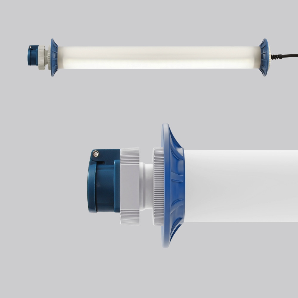 Schutzrohr Kunststoff (Polycarbonat) opal, schlagzäh. Endkappen aus Kunststoff (Polyamid) grau. Protektoren aus weichem Kunststoff an den Enden zum Schutz beim mobilen Einsatz. Homogene, weiche und blendreduzierte Ausleuchtung. Betriebsgerät integriert. Eine Steckdose ermöglicht den Anschluss weiterer Leuchten oder elektrischer Geräte. Schwere Gummischlauchzuleitung H07RN-F für hohe mechanische Belastungen mit Netzstecker. Durch Zubehör (optional) für Wand-, Decken- und Pendelmontage geeignet. Zur Leuchte ist immer ein Montagezubehör mit zu bestellen. Leuchte mit begrenzter Oberflächentemperatur nach DIN EN 60598-2-24.