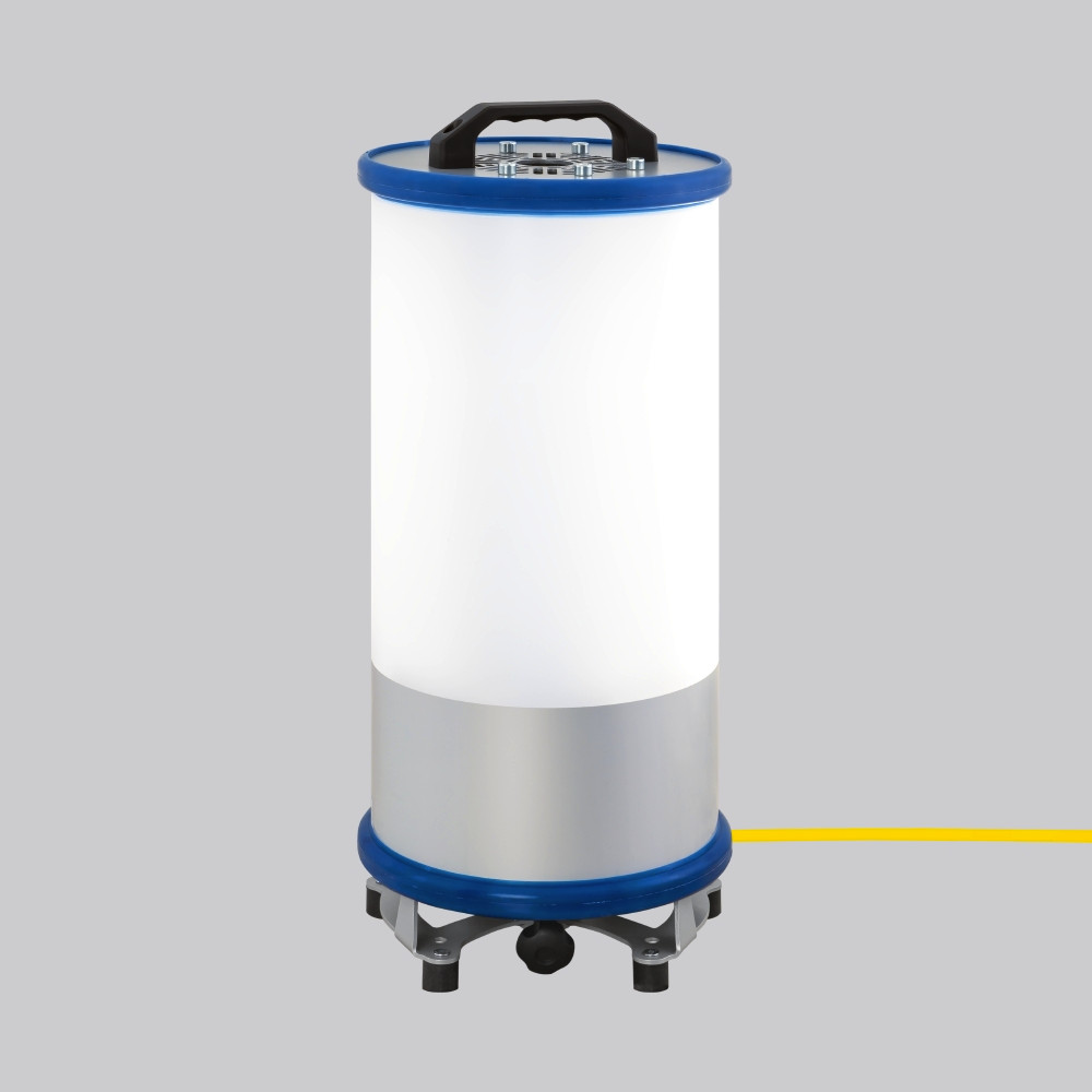 Großflächenleuchte. Gehäuse Aluminium pulverbeschichtet. Fußplatte aus Stahl, pulverbeschichtet, mit Gummi-Füßen. Abdeckung opal, aus schlag- und bruchfestem Kunststoff (Polycarbonat). Homogene, weiche und blendreduzierte Ausleuchtung. Auf Stativ, als Bodenleuchte oder aufgehängt einsetzbar. Aufnahmehülse für Stativ-Zapfen d=30mm, DIN 14640. Ein/Aus und dimmbar per Bluetooth-App (Casambi). Inkl. Transporttasche.