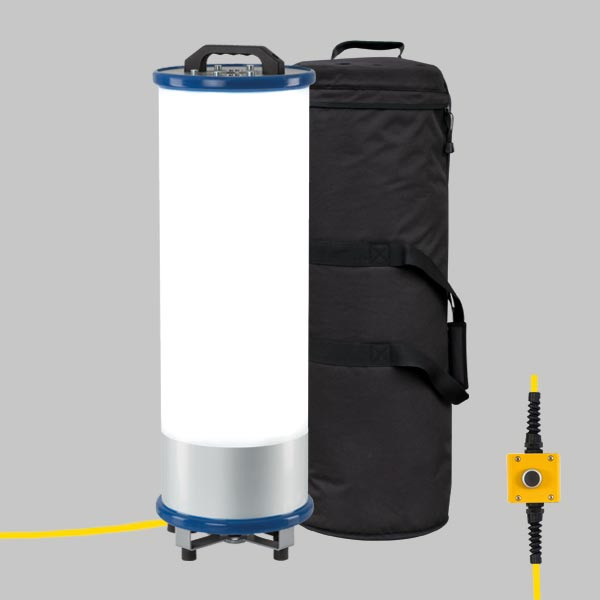 Großflächenleuchte. Gehäuse Aluminium pulverbeschichtet. Fußplatte aus Stahl, pulverbeschichtet, mit Gummi-Füßen. Abdeckung opal, aus schlag- und bruchfestem Kunststoff (Polycarbonat). Homogene, weiche und blendreduzierte Ausleuchtung. Auf Stativ, als Bodenleuchte oder aufgehängt einsetzbar. Aufnahmehülse für Stativ-Zapfen d=30mm, DIN 14640. Ein/Aus und dimmbar per Bluetooth-App (Casambi). Inkl. Transporttasche.