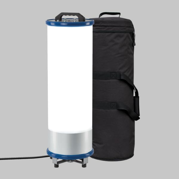 Großflächenleuchte. Gehäuse Aluminium pulverbeschichtet. Fußplatte aus Stahl, pulverbeschichtet, mit Gummi-Füßen. Abdeckung opal, aus schlag- und bruchfestem Kunststoff (Polycarbonat). Homogene, weiche und blendreduzierte Ausleuchtung. Auf Stativ, als Bodenleuchte oder aufgehängt einsetzbar. Aufnahmehülse für Stativ-Zapfen d=30mm, DIN 14640. Wechselschalter (Aus, 180° Ausleuchtung, 360° Ausleuchtung). Inkl. Transporttasche.