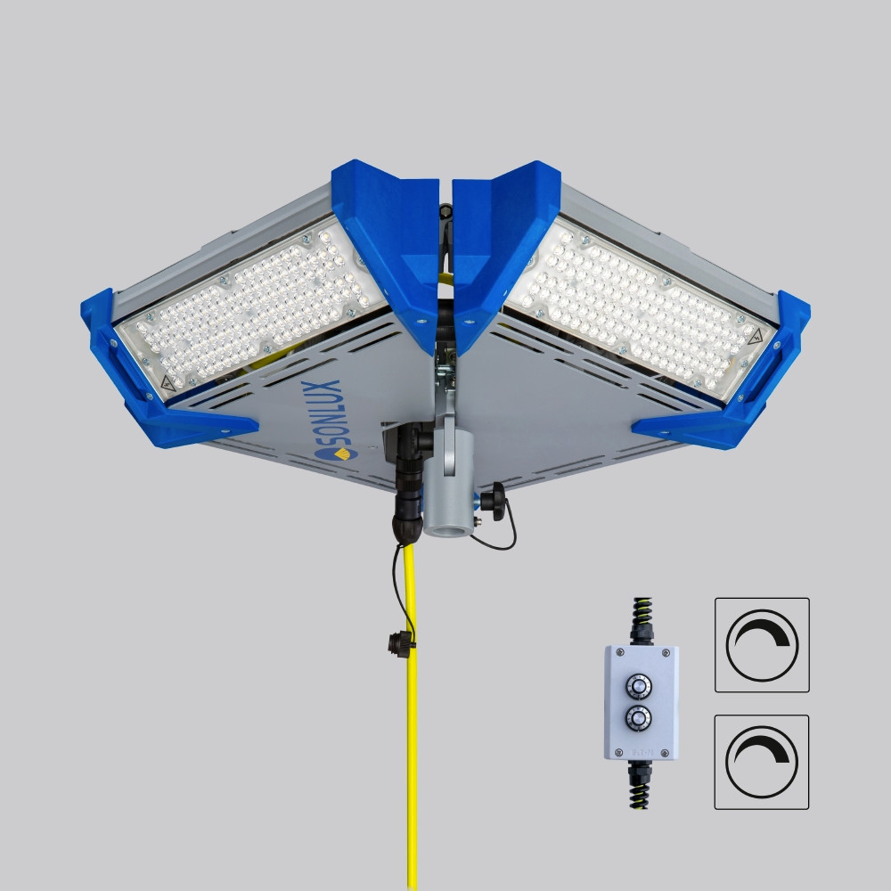 Großflächenleuchte. Gehäuse aus Aluminium, pulverbeschichtet. Ecken geschützt durch Kunststoffkappen. Hocheffiziente LED-Einheiten mit optimaler Lichtlenkung durch präzise Linsenoptik aus Kunststoff (PC) klar. Zusammengeklappt auf dem Boden, aufgeklappt auf Stativ oder hängend einsetzbar. Beide Seiten getrennt dimmbar mit Potentiometer. Robuste PUR-Schlauchleitungen H07BQ-F für hohe mechanische Belastungen mit Netzstecker. Inkl. Adapter für Zapfen-Aufnahme (d=30 mm, DIN 14640) mit der Möglichkeit einer geraden oder geneigten Montage (30, 60, 90°). Inkl. Husse zum Schutz und Aufnahme der Zuleitung beim Transport.