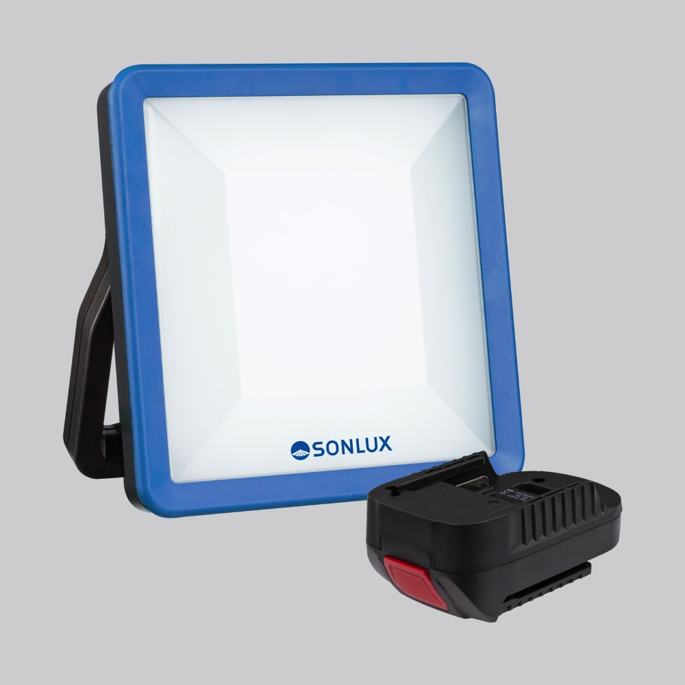 Mobile, netzunabhängige Akku-Arbeitsleuchte. Schlag- und bruchfestes 2-Komponenten-Kunststoff-Gehäuse. Kantenschutz und Griff mit weichem Kunststoff (thermoplastisches Elastomer - TPE). Abdeckung opal, aus schlag- und bruchfestem Kunststoff (Polycarbonat). Homogene, weiche und blendreduzierte Ausleuchtung durch Multi-LED-Technologie, opaler Abdeckscheibe und großer Lichtaustrittsfläche. Lichtrichtungsabgabe einstellbar mit Bügel aus Kunststoff (ABS). Geeignet für den Betrieb mit Bosch Professional 18V Wechsel-Akkus (Liste verwendbarer Akkus siehe Instruktion) und mit Adapter für Makita 18V Wechsel-Akkus. Ergonomisch platziertes Bedienfeld mit Tastern für Ein/Aus und Dimmen in Schritten 10, 25, 50, 75 und 100%. Umfangreiches Zubehör optional erhältlich (Stative, Halteschienen, Magnethalter, etc.).