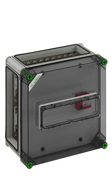 Sammelschienengehäuse, 5-polig, 40mm Sammelschienenabstand, mit CU-Schienen, L1...L3: 12 x 5mm, PE/N: 12 x 5mm, mit 10 Klemmen für CU-Leiter 4-35mm², mit Berührungsschutzabdeckung, mit Klappfenster 12 TE, plombierbar, 1x Abdeckstreifen 12TE verriegelbar, 3 x Gehäuseverbinder (GGV), mit transparentem Deckel, mit Blitzstrom- und Überspannungs-Ableiter Typ 1+2 nach EN 61643-11 für Hauptstrom-Versorgungssysteme, Netzform TT/TNS, für den Einsatz bei Gebäuden mit äußerem Blitzschutz (BSK III/IV), Blitzstrom: (10/350) 12,5/50kA, höchste Dauerspannung: 255 V AC, max. zul. Vorsicherung: 160A gG, anschlussfertig montiert auf Sammelschienensystem