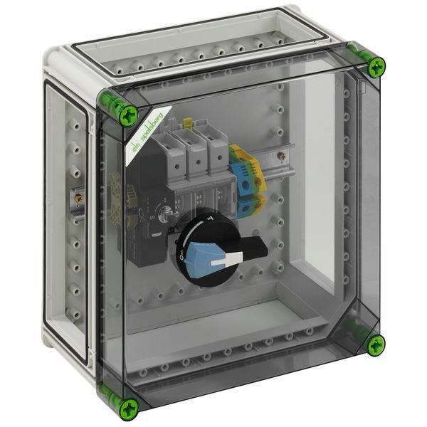 Lasttrennschaltergehäuse mit externer Betätigung, abschließbar, 1 x Lasttrennschalter 100A, 3-polig schaltend, Käfigklemme 10-70mm², für CU-Leiter, PE/N-Klemme 35mm², 3 x Gehäuseverbinder (GGV), mit transparentem Deckel