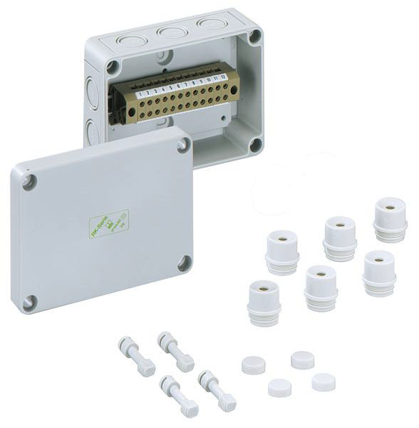 Reihenklemmengehäuse, mit Schutzart IP54/IP66, Nennquerschnitt 4mm², Ui=400V AC, Polystyrol, innenliegende Befestigungsstellen, für Standardinstallationen im Innenbereich, bestückt mit 12-polige Blockklemme 4mm² (Typ Contaclip BKA 4)
