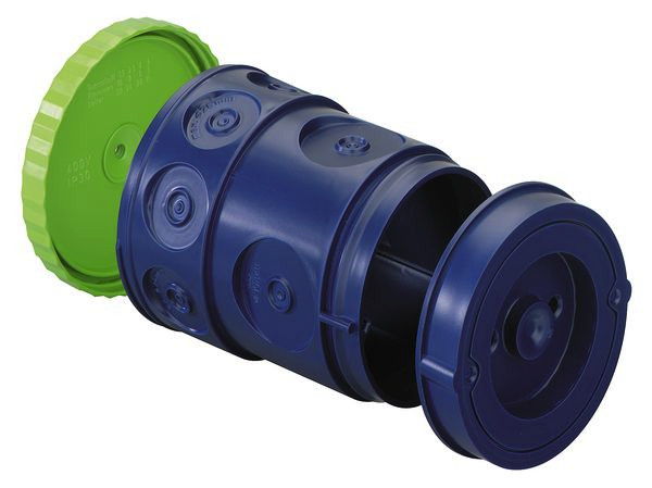80 mm Ø vorn, 92 mm Ø hinten, Höhe 122 mm, für Fertigung im Betonwerk, Spezialdose für Teilfertigdecken bis 6,5 cm, 8 Einführungen bis max. 26 mm Ø, 4 Einführungen bis max. 35 mm Ø, mit Gewindebuchse M5 zur Aufnahme eines Deckenhakens (979 121 01)
