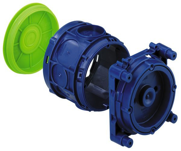 für Magnetbefestigung Geräte-Verbindungsdose, auch in Fertigteilwerken, 4 Schraubdome mit Schraubabstand 60mm, kombinierbar im Normabstand 71mm, vollisolierter Leitungsübergang, geeignet für alle Schalungsarten und Gegenschalung, mit Schutzart IP30, Bemessungsisolationsspannung: 400V AC, zertifiziert durch VDE (DIN EN 60670-1/-22 (VDE 0606-1/-22)), halogenfrei, 3-teilig, Magnet- oder Nagelbefestigung, Membran zur Lochung, Dichtbereich M16-M25, stützholmfähig