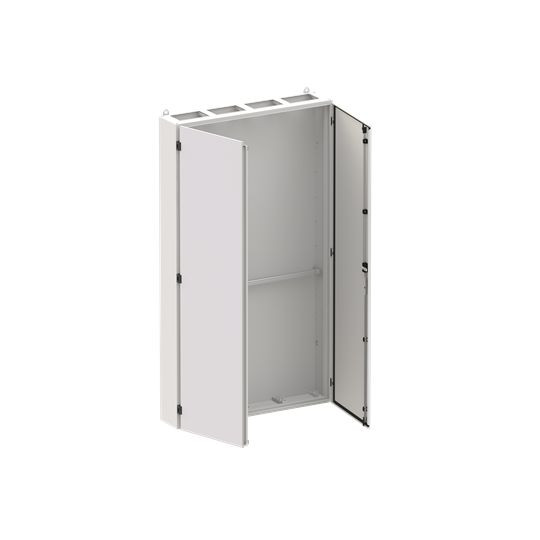 Standschrank, Baureihe TwinLine, Leerschrank, Montageart: Aufputz, teilversenkt, für den Innenbereich, mit Tür, Schutzklasse I (geerdet), Schutzart IP44, geltende Normen: DIN EN 61439-1, VDE 0660-600-1, IK-Code 08, pulverbeschichtet, in RAL 7035, Gehäuse aus Stahlblech, Doppeltür, Tür aus Stahlblech, mit Standardverschluss Doppelbart 3 mm, Türöffnungswinkel 180 Grad, Türanschlag rechts oder links, Rückwand aus Stahlblech, Leitungseinführung oben über Flanschöffnung ausgeschnitten, unten über Flanschöffnung vorgeprägt, Abmessungen in mm (H x B x T): 1850 x 1050 x 225, Rasteinheit 12 RE, Bauhöhe 8, Feldbreite 4, Platzeinheiten 576, vorbereitet zum Einbau von Verteilerfeldern und CombiLine Modulsystemfeldern