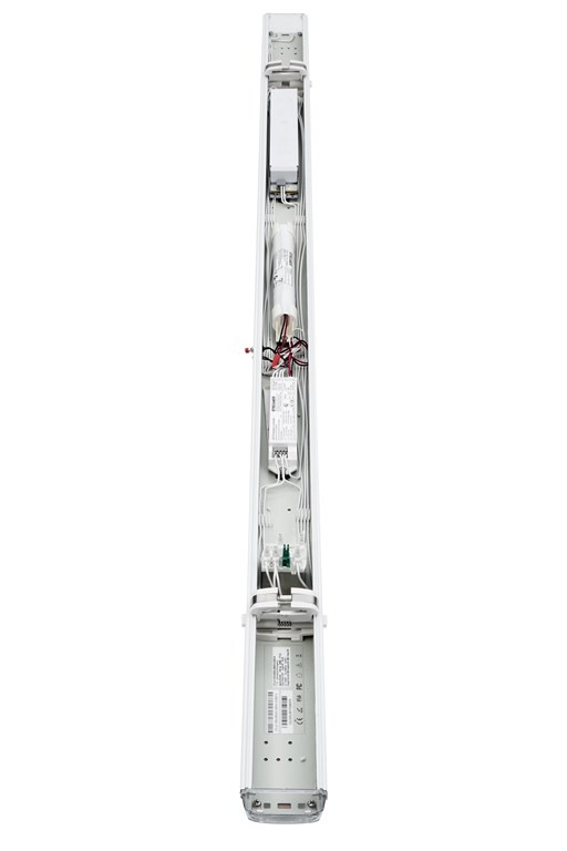 RTS LED linear luminaire for industrial and commercial applications. 1500 mm length with wide optics provide homogeneous light distribution for open areas. Fitted with switching EM driver + 3W convertor + BST NICD 4.8V 3.0Ah (Self-contained Version). Steel housing, White color, 0 … +40 °C operating temperature range, 4000 K, CRI 80, 3 SDMC. 53 W power consumption, 8000 lm luminous flux, 151 lm/W efficacy, 1500 mm x 70.2 mm x 78.6 mm (L x W x H) dimensions, IP20, IK03, 220-240 V 50/60 Hz, Class I. Lifespan L70:B50 120,000 hours.