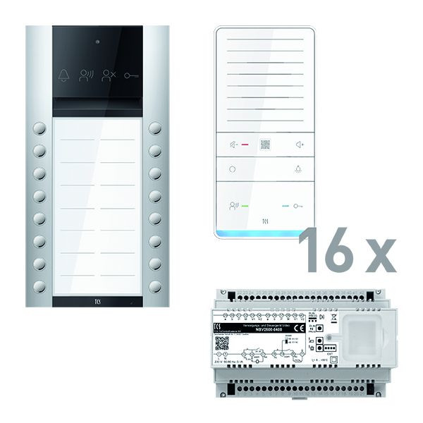 Vorkonfiguriertes Paket für 16 Wohneinheiten für den TCS:BUS bestehend aus: 1x PES PRO Audio Außenstation 16T AP EN, Artikelnummer: ASA110216-0010, vorprogrammiert, 16x TASTA Freisprecher AUDIO PLUS WS SDI, Artikelnummer: ISW6031-0145, 1x Versorgungs- und Steuergerät Video 8 TE, Artikelnummer: NBV2600-0400, das Paket ist ab Werk vorkonfiguriert und bedingt erweiterbar. Die Funktionen der Innen- und Außenstationen können mit TCS-Serviceprodukten bedingt verändert werden.