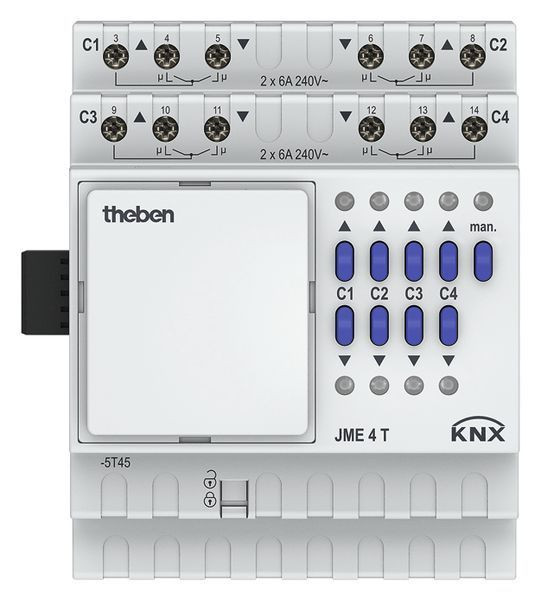KNX Jalousieaktor, 4-fach Antriebssteuerung, Erweiterungsgerät, Reiheneinbaugerät, Breite 4 TE (4 TE), erweiterbar mit JME 4 T bis zu 12 Kanäle oder kombinierbar mit anderen Geräten der MIX-Serie, Relaisausgänge für vier Antriebe, Antriebe: z. B. für Jalousien, Rollladen, Markisen, manuelle Bedienung am Gerät, Schlupfkorrektur, Antrieb frei parametrierbar, Handschalter AUF/AB und LEDs