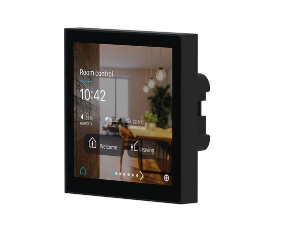 KNX-Raumcontroller für Temperatur, Luftfeuchtigkeit (relativ), Näherung und Helligkeit, 4 Zoll Touch-Display mit Bildschirmauflösung 480 x 480 px, ermöglicht auf bis zu 6 Seiten (mit je 8 Funktionen) die Steuerung und Bedienung verschiedener Funktionen wie Schalten, Dimmen, Jalousie- oder Raumklimasteuerung im Wohn- und Objektbau, Hintergrundbilder frei wählbar über Micro SD-Karte