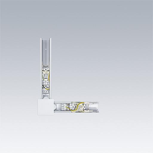 Mechanischer und elektrischer Verbinder, L, weiß. Einschließlich ein Stecker und eine Buchse zur mechanischen Verbindung und 2 Anschlussklemm-Gruppen für die Stromein- oder -ausspeisung. Gewicht: 1,7 kg