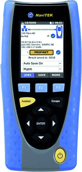 NaviTEK IE PROFINET-Tester zur Inbetriebnahme, Wartung und Fehlerdiagnose für Industrial-Ethernet PROFINET-Netzwerke sowie Ethernet-IP-Standardnetzwerke. Ermittelt die Konfigurationen von Netzwerken und Geräten sowie mögliche Fehlerstellen und Verdrahtungspläne. Überprüft den Status des Netzwerkes mit Ampelfarben, zeigt alle Knotenparameter des Netzwerkes, wie IP-Adresse, Anbieter, Softwareversion an. NETMAP-Funktion scannt das gesamte Netzwerk zur Erkennung von Änderungen und das bis zu 48 Stunden-Ereignisprotokoll hilft beim Auffinden von falsch konfigurierten Geräten. Testet M12-PROFINET Kupferkabeln D- oder X-kodiert und Glasfaserkabeln über SFP-Module (optional). Generiert automatisch Testberichte im PDF- oder CSV-Format mit Firmenlogo und Firmenangaben. Standortunabhängige Übermittlung der Testberichte mit der kostenlosen App AnyWARE. Darüber hinaus unterstützt der kompakte Tester umfassende Test- und Diagnosefunktionen wie IPv4, IPv6, PoE/PoE+-Erkennung, Ping- und Traceroute-Test, DHCP-Client, HUB-Blink, Switch-Erkennung 10/100/1000 Mbit/s, Tongenerator, Netzwerk-Scanner-Anzeige, Port-Identifikation mit EDP/CDP/LLDP-Protokollen.