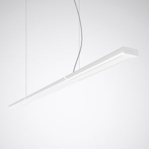 Exklusive LED-Hängeleuchte mit direktem und indirektem Lichtstromanteil und seitlich sichtbarer Lichtlinie. Zur Verwendung als Einzelleuchte oder als Anfangsleuchte in einem Lichtband, das Endstück ist im Lieferumfang enthalten. Seilabhängung bereits im Lieferumfang enthalten. Für abgehängte Montage als Einzel- oder Lichtbandleuchte. Seilabhängung bereits im Lieferumfang enthalten (2000 mm). Standard Abpendellänge: 1000 mm. Neben der üblichen Montage parallel zur Fensterfront kann die Leuchte auch parallel zur Bauachse des Gebäudes geplant und installiert werden. Mit innenliegender, hocheffizienter Mikro-Prismatik CDP-I. Klare Abschlussscheibe mit seitlicher Lichtaustrittskante. Mit symmetrisch begrenzt breit strahlender Lichtstärkeverteilung. Blendungsbewertung nach UGR-Einstufung (EN 12464-1) < 19. Bildschirmarbeitsplatzgerecht gemäß EN 12464-1 Durch die seitliche Anordnung der Lichtmodule werden Spiegelungen auf glänzenden Oberflächen nahezu vermieden. Leuchtenlichtstrom und Lichtfarbe fest eingestellt. Bemessungslichtstrom 13100 lm, Bemessungsleistung 79 W, maximale Leuchten-Lichtausbeute 166 lm/W. Lichtfarbe warmweiß, ähnlichste Farbtemperatur (CCT) 3000 K, allgemeiner Farbwiedergabeindex (CRI) Ra > 80. Farborttoleranz (initial MacAdam) = 3 SDCM. Mittlere Bemessungslebensdauer L80 (tq 25 °C) = 50.000 h. Die Lichtquelle ist entsprechend der Ökodesign-Anforderungen (VO (EU) 2019/2020) austauschbar. Flimmern: Pst LM = 1,0 bei Volllast. Stroboskop-Effekt: SVM = 0,4 bei Volllast. Leuchtenkörper aus Stahlblech.Kopfstücke aus PC. Oberfläche weiß beschichtet (ähnlich RAL 9016). Maße (L x B): 2107,5 mm x 102 mm, Leuchtenhöhe 37 mm. Schutzklasse (EN 61140): I, Schutzart (DIN EN 60529): IP20, Stoßfestigkeitsgrad nach IEC 62262: IK02, Prüftemperatur Glühdrahttest gemäß IEC 60695-2-11: 650 °C. Zulässige Umgebungstemperatur (ta): 25 °C . Gewicht: 6,7 kg. Transparente Anschlussleitung im Lieferumfang enthalten (1000 mm). Mit zwei elektronischen Betriebsgeräten, digital dimmbar (DALI). Betriebsgerät gemäß DALI-2-Standard (EN 62386). Leuchte mittels Tastfunktion über DALI-Steuerklemmen schalt- und dimmbar (Touch DIM). Das Betriebsgerät ist entsprechend der Ökodesign-Anforderungen (VO (EU) 2019/2020) austauschbar. Die Leuchte ist Monitoring ready (MOR) und liefert Leuchtendaten zur Überwachung oder vorausschauenden Wartung. Sie ist damit kompatibel zu den TRILUX Monitoring Services. Das Produkt erfüllt die grundlegenden Anforderungen der anwendbaren EU-Richtlinien und des Produktsicherheitsgesetzes und trägt die CE-Kennzeichnung. Zusätzlich ist die Leuchte durch eine unabhängige Prüfstelle ENEC-zertifiziert. Leuchte 10 Jahre, Ersatzteile (LED-Modul, Betriebsgerät, optisches System) 15 Jahre nach Rechnungsdatum unter Vorbehalt vertretbarer Änderungen, die dem Fortschritt dienen, verfügbar.