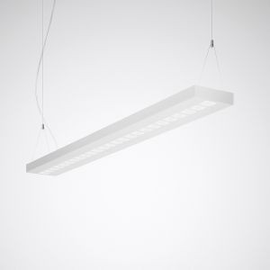 LED-Hängeleuchte mit hocheffizienten Lichtelementen aus Linsensystemen und kubischen Abblendelementen. Für Einzel- oder Lichtbandanwendungen mittels separet zu bestellender Zubehöre. Geeignet zur Ausführung von Durchgangsverdrahtungen. Das optische System mit einer präzise abgestimmten Kombination aus LED-Linsen und Abblendelementen bewirkt einen sehr hohen Sehkomfort bei sehr hoher lichttechnischer Performance. Mit symmetrisch begrenzt breit strahlender Lichtstärkeverteilung. Blendungsbewertung nach UGR-Einstufung (EN 12464-1) < 19. Bildschirmgerecht gemäß EN 12464-1 durch begrenzte Leuchtdichten L = 1500 cd/m2 für Ausstrahlungswinkel oberhalb 65° rundum. Leuchtenlichtstrom und Lichtfarbe fest eingestellt. Bemessungslichtstrom 5800 lm, Bemessungsleistung 42 W, maximale Leuchten-Lichtausbeute 138 lm/W. Lichtfarbe neutralweiß, ähnlichste Farbtemperatur (CCT) 4000 K, allgemeiner Farbwiedergabeindex (CRI) Ra > 80. Farborttoleranz (initial MacAdam) = 3 SDCM. Mittlere Bemessungslebensdauer L80 (tq 25 °C) = 100.000 h., Mittlere Bemessungslebensdauer L90 (tq 25 °C) = 50.000 h. Die Lichtquelle ist entsprechend der Ökodesign-Anforderungen (VO (EU) 2019/2020) austauschbar. Flimmern: Pst LM = 1,0 bei Volllast. Stroboskop-Effekt: SVM = 0,4 bei Volllast. Leuchtenkörper aus Stahlblech. Oberfläche weiß beschichtet (ähnlich RAL 9016). Abblendkuben weiß, mit feiner Oberflächenstruktur (RAL 9016). Maße (L x B): 1509 mm x 170 mm, Leuchtenhöhe 46 mm. Die Abblendkuben können auf Anfrage in weiteren RAL-Farbtönen ausgeführt werden. Schutzklasse (EN 61140): I, Schutzart (DIN EN 60529): IP20, Stoßfestigkeitsgrad nach IEC 62262: IK03, Prüftemperatur Glühdrahttest gemäß IEC 60695-2-11: 650 °C. Zulässige Umgebungstemperatur (ta): 25 °C . Gewicht: 7,0 kg. Mit elektronischem Betriebsgerät, digital dimmbar (DALI). Betriebsgerät gemäß DALI-2-Standard (EN 62386). Leuchte mittels Tastfunktion über DALI-Steuerklemmen schalt- und dimmbar (Touch DIM). Das Betriebsgerät ist entsprechend der Ökodesign-Anforderungen (VO (EU) 2019/2020) austauschbar. Die Leuchte ist Monitoring ready (MOR) und liefert Leuchtendaten zur Überwachung oder vorausschauenden Wartung. Sie ist damit kompatibel zu den TRILUX Monitoring Services. Das Produkt erfüllt die grundlegenden Anforderungen der anwendbaren EU-Richtlinien und des Produktsicherheitsgesetzes und trägt die CE-Kennzeichnung. Die Leuchte ist Bestandteil eines Sortiments von Einbau-, Anbau- und Hängeleuchten, die im Erscheinungsbild aufeinander abgestimmt sind. Projektspezifische Ausführungen mit variierenden Leuchtenmerkmalen sind auf Anfrage möglich. Leuchte 10 Jahre, Ersatzteile (LED-Modul, Betriebsgerät, optisches System) 15 Jahre nach Rechnungsdatum unter Vorbehalt vertretbarer Änderungen, die dem Fortschritt dienen, verfügbar.