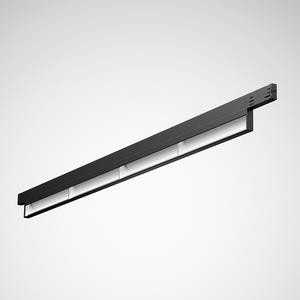Stromschienen-Leuchte für 3-Phasen-Stromschiene. System Rail (Stucchi). Wallwasher für die Stromschiene zur besonders gleichmäßigen und klaren Ausleuchtung von Wänden, Grafiken und Abbildungen. Befestigung an 3-Phasen-Stromschiene gemäß DIN EN 60570 mittels integriertem 3-Phasen-Stromschienenadapter. Bei der Planung ist die Polarität des Nullleiters zu beachten. Lage der Polarität, siehe rote Markierung in der Maßskizze. Wallwasher mit asymmetrischer Lichtstärkeverteilung. Leuchtenlichtstrom und Lichtfarbe fest eingestellt. Bemessungslichtstrom 1900 lm, Bemessungsleistung 23 W, maximale Leuchten-Lichtausbeute 83 lm/W. Lichtfarbe warmweiß, ähnlichste Farbtemperatur (CCT) 3000 K, allgemeiner Farbwiedergabeindex (CRI) Ra > 90. Farborttoleranz (initial MacAdam) = 3 SDCM. Mittlere Bemessungslebensdauer L80 (tq 25 °C) = 50.000 h. Flimmern: Pst LM = 1,0 bei Volllast. Stroboskop-Effekt: SVM = 0,4 bei Volllast. Leuchtenkörper feinstruktur-pulverbeschichtet. Aus Aluminium. Oberfläche schwarz beschichtet (ähnlich RAL 9005). Leuchtenmaße (L x B x H): 1130 mm x 14 mm x 70 mm. Schutzklasse (EN 61140): II, Schutzart (DIN EN 60529): IP20, Stoßfestigkeitsgrad nach IEC 62262: IK02, Prüftemperatur Glühdrahttest gemäß IEC 60695-2-11: 650 °C. Zulässige Umgebungstemperatur (ta): 25 °C Gewicht: 0,9 kg. Mit elektronischem Betriebsgerät, digital dimmbar (DALI). Betriebsgerät gemäß DALI-2-Standard (EN 62386). Das Produkt erfüllt die grundlegenden Anforderungen der anwendbaren EU-Richtlinien und des Produktsicherheitsgesetzes und trägt die CE-Kennzeichnung.