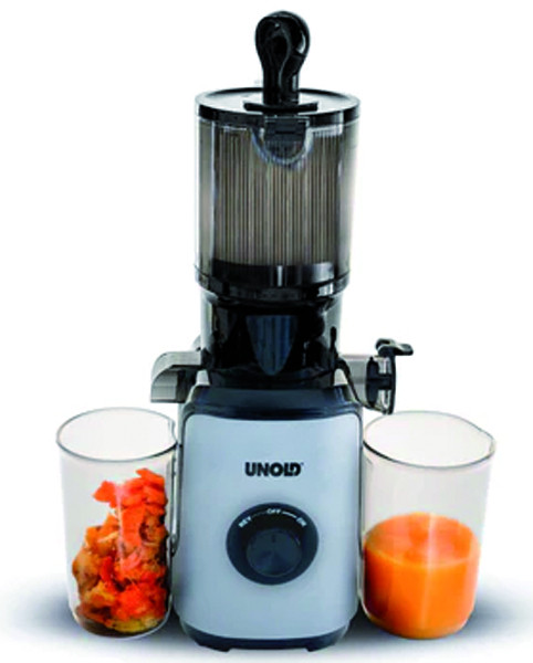 vitaminschonendes, geräuscharmes Entsaften durch langsames Pressen (40-80 U/min), große Einfüllöffnung: 110 mm - für ganze Früchte, Saft - und Fruchtfleischbecher je ca. 800 ml, doppellagiger Edelstahlfilter für Säfte mit glatter Textur, Ein-/Ausschalter mit Rückwärtslauf, Anti-Tropf-Auslauf, Quick-Clean: komplett zerlegbar, alle nicht elektrischen Teile spülmaschinengeeignet, Sicherheitsverriegelung, 100% BPA-frei