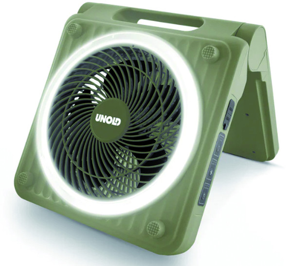 Akku-Solar-Ventilator für innen und außen, 5-stufige Geschwindigkeitsregelung per Tastendruck, Timerfunktion mit automatischer Abschaltung, variable LED-Beleuchtung durch 3 einstellbare Helligkeitsstufen, aufladbar mit USB-Ladekabel oder integriertem Solarmodul aus langlebigem monokristallinem Silikon und robustem PET-Material, Li-Ion-Akku, Akkubetrieb je nach Stufe ca. 1 - 24 Stunden, Akkuladezeit ca. 4-5 Std.per USB-Ladekabel oder in etwa 10 Std. mit Sonnenenergie (abhängig von der Lichtintensität), Powerbank-Funktion (integrierte 5000-mAh Batterie für zusätzliche Energie unterwegs), inklusive USB-C-Ladekabel, Schutzklasse IPX4 - ideal bei Spritzwasser