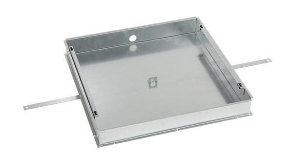 Einbaugehäuse VZ-EG aus verzinktem Blech zum Einfügen in eine Beton-Halbfertigteildecke für ein rahmenlosens, integrierbares Glaselement VH-IB. Das Einbaugehäuse VZ-EG und das passende Glasheizelement VH-IB sind jeweils separat bestellbar (je nach Baufortschritt).