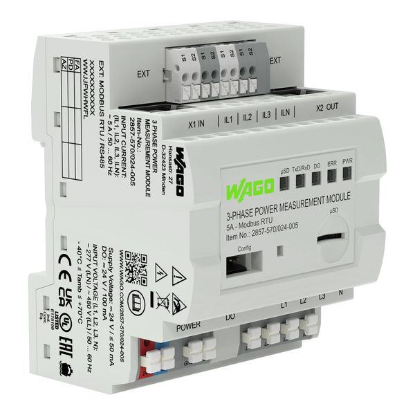 Das 3-Phasen-Leistungsmessmodul im Reiheneinbaugehäuse dient zur Messung elektrischer Daten in dreiphasigen Versorgungsnetzen, abgesetzt von der Steuerungsebene. Messgrößen wie Wirkleistung, Scheinleistung, Blindleistung, Energieverbrauch, Leistungsfaktor, Phasenwinkel sowie Frequenz können über eine Modbus®-Schnittstelle abgerufen werden. Zusätzlich können die Messgrößen auf eine microSD-Karte gespeichert werden.