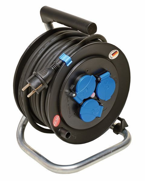WALTHER Sicherheits-Kabeltrommel 230V mit Trommelkörper aus hochbruchfestem Spezialkunststoff stabiles, verzinktes Fußgestell mit geformten Haltegriff, Feststellbremse und LeitungsführungGesamtschutzart: IP44Bemessungsstrom: 16ALeistung bei aufgewickelter Leitung: 1500WLeistung bei abgewickelter Leitung: 3500WAbmessungen: 325 x 225 x 200mm (HxBxT) 230mm DurchmesserAnschluss:25m Gummischlauchleitung H07RN-F3G1,5 mit Schutzkontaktstecker entspricht BGI608 (DGUV-I 203-006)/K2 (BGI600) "- Gewerbe, Baustelle -"Abgänge:1 Thermoschutzschalter3 Schutzkontaktsteckdosen 16A 3P 230V mit Klappdeckel