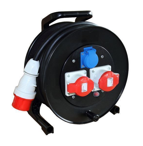 | Kurzbeschreibung | Kabeltrommel 400V mit 2 CEE-Abgänge 16A, einer Schukos und Anschluss über 25m Gummischlauchleitung H07RN-F5G2,5 mit CEE-Stecker 16A |