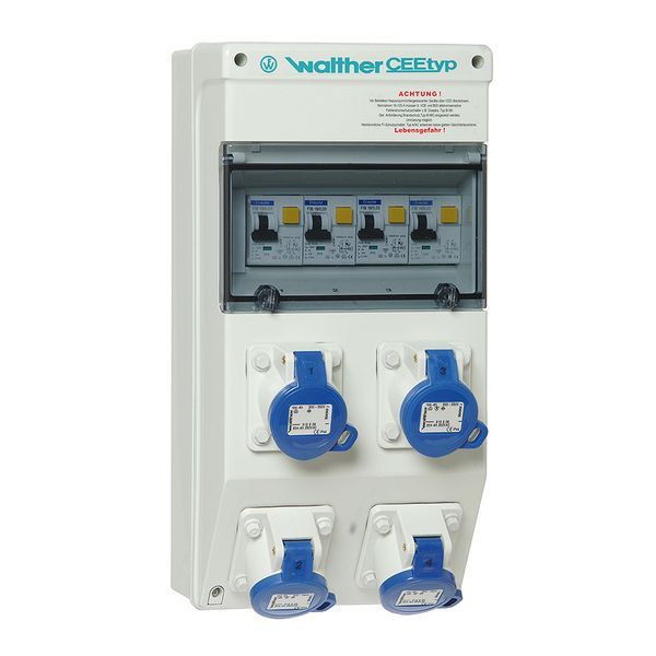 | Kurzbeschreibung | Kunststoff Steckdosenkombination In:40A mit 4 RCBOs, und 4 CEE-Abgänge 16A abschließbar mit Vorhängeschloss |