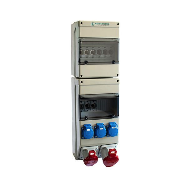 | Kurzbeschreibung | Kunststoff-Steckdosenkombination In: 63A mit 5 Sicherungssockel, 2 CEE-Abgänge 16-32A und 3 Schukos |