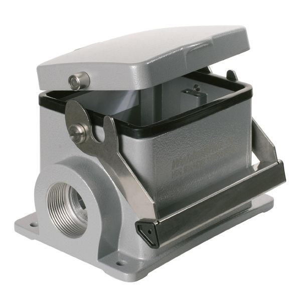Kurzbeschreibung Gehäuse Industriesteckverbinder, Sockelgehäuse, Längsbügel am Unterteil, Baugröße: 10, IP65, im gestecktem Zustand