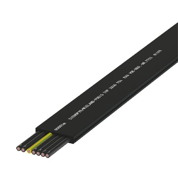 Flachleitung 7 x 4 mm² EVA, feindrähtig, Adern nummerncodiert, Außenmaß ca. 35 x 6 mm, Gewicht ca. 440 g/m, 450/750V nach VDE, halogen- und silikonfrei, beständig gegen Öle und Säuren, geringe Brandlast, Mantel schwarz