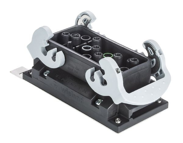 Flachleitungsabgang FCS 4 7 SI BU FM steckbar mit Schnellmontageplatte für Gitterkanal Obo-Bettermann; 7polig, 20 A; 277/480V 4kV/3(VDE); 600V (UL, CSA); Buchse mit Kunststoffverriegelungsbügel; Schutzart IP65 gesteckt oder mit Schutzdeckel 07.409.7256.0; schwarz