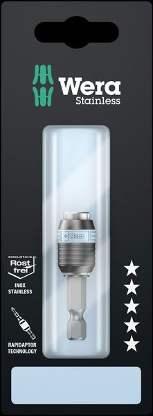 Universalhalter für die Aufnahme von Bits mit 1/4"-Außensechskantantrieb nach DIN ISO 1173-C 6,3 und E 6,3 (ISO 1173). Edelstahlausführung zur Vermeidung von Fremdrost. Die Rapidaptor-Technologie erlaubt eine Aufnahme der Bits auch ohne Betätigung der Hülse. Die Entnahme des Bits geschieht durch einfaches Nach-vorn-Schieben - für blitzschnellen Bitwechsel, auch mit nur einer Hand. 1/4"-Sechskant, passend für Schraubermaschinen mit Aufnahme nach DIN ISO 1173-F 6,3.