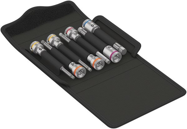 Bicycle Set 8, 7-teilig 2x 8767 B innensechsrund Zyklop Bitnuss mit 3/8"-Antrieb, mit extra schlankem Profilbereich: TX 25x107 mm, TX 30x107 mm 5x 8740 B Zyklop Bitnuss mit 3/8"-Antrieb, mit extra schlankem Profilbereich: 4x107 mm, 5x107 mm, 6x107 mm, 8x100 mm, 10x100 mm 1x Klettstreifen 120: 120 x 50 mm7-teiliges Bitnuss-Set mit 3/8" Antrieb für typische Fahrradanwendungen. Bitnüsse mit 30 mm langem und extra schlankem Profilbereich für bessere Zugänglichkeit in engen Arbeitsräumen. Die Rändelung erleichtert die Handverschraubung ohne Abrutschen. Mit Take it easy Werkzeugfinder mit Farbkennzeichnung nach Größen - zum einfachen und schnellen Finden des benötigten Werkzeugs. 05004176001