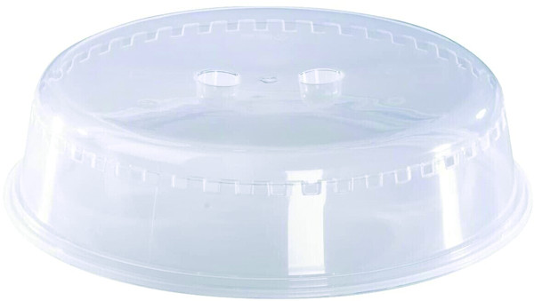 zum Erwärmen von Speisen in der Mikrowelle, zuverlässiger Spritzschutz, verkürzt die Garzeit durch Verkleinerung des Garraums, Dampfaustrittsöffnungen am äußeren Rand vermeiden Überdruck, praktische Vertiefungen in der Mitte zur leichten Abnahme der Haube von den Speisen