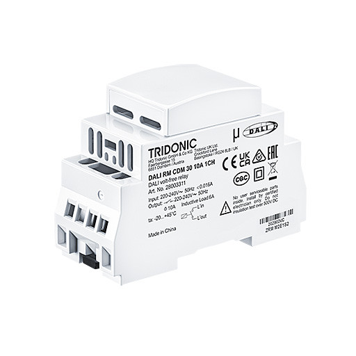 DALI-2 Relais, Kompatibel mit DALI und DALI-2, Entspricht IEC 62386-208, 1-Kanal-Stellglied (Schalter) mit DALI-2-Eingang, Geschützt gegen DALI-Überspannung, Geeignet für die Schaltschrankmontage auf 35 mm Hutschiene, Relaisausgang für Netzspannung mit potenzialfreiem Kontakt, Konformes DALI-Gerätetyp 7, Kleine Abmessungen
