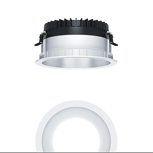 LED Decken-Einbauleuchte (Komplettleuchte) R200, symmetrisch, breitstrahlender Lichtverteilung (80 °), höchste Leuchteneffizienz und eine optimale Downlight Lichttechnik, hohe Nachhaltigkeit aufgrund durchgängigen, maximal- modularen Aufbau und austauschbaren Komponenten, Austauschbares LED-Modul, Farbwiedergabe Ra > 90, Farbtemperatur (tunable) 2700-6500 K (DT8), Farborttoleranz (initial MacAdam): 2, Leuchten Leistung: 10,1 W, Leuchten Lichtstrom: 1120 lm, Leuchten Lichtausbeute: 111 lm/W, Mittlere Bemessungslebensdauer: L80 100000 h bei 25 °C + L90 50000 h bei 25 °C, mit separaten, steckbaren LED-Konverter, DALI steuerbare Leuchte (DALI only) mit DC-Funktion, einstellbar 5-100 %, Notstromlevel auf 15% voreingestellt, DALI konfigurierbar, SwitchDIM-kompatibel, hochwertige Reflektoreinheit über Bajonettverschluss an modularer LED-Lichtkammer arretiert, hocheffiziente LED Lichtkammer integriert im optimierten, passives Wärmemanagement aus hochwertigem wärmeleitendem Polycarbonat, Reflektor/Abdeckring aus hochwertigem, UV-beständigem Polycarbonat (PC), Reflektor: glatt, aluminiumbesputtert, silber matt glänzend, irisierungsfrei, Abdeckring: weiß, Einbauring aus Polycarbonat (PC), weiß, Schutzart: IP54_IP20, Leuchte halogenfrei verdrahtet, Anschluss: 3-polige Steckverbindungsklemme, Durchschleifen möglich, Netzspannung: 220-240 V / 0/50/60 Hz, Zentralbatterietauglich 220-240V DC, Montage: werkzeuglose Schnellmontage mittels Anti-Rutsch-Haltefedern für Deckenstärken von 1-40mm (je nach Leuchtenvariante) aufgrund austauschbarer Haltestege, werkzeuglose Schnellmontage der Leuchteneinheit mittels Bajonettverschluss, Deckenausschnitt: 200mm, Einbautiefe: 120mm, Gewicht: 0,75 kg Für Office Anwendungen gemäß EN12464 (UGR<19 Reflektortyp aluminiumbesputtert)
