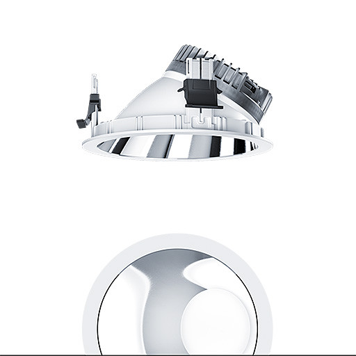 LED Decken-Einbauleuchte (Komplettleuchte) R200, asymmetrischer Lichtverteilung für die homogene Beleuchtung vertikaler Flächen (82 °), höchste Leuchteneffizienz und eine optimale Downlight Lichttechnik, hohe Nachhaltigkeit aufgrund durchgängigen, maximal- modularen Aufbau und austauschbaren Komponenten, Austauschbares LED-Modul, Farbwiedergabe Ra > 90, Farbtemperatur (tunable) 2700-6500 K (DT8), Farborttoleranz (initial MacAdam): 2, Leuchten Leistung: 17,1 W, Leuchten Lichtstrom: 1990 lm, Leuchten Lichtausbeute: 116 lm/W, Mittlere Bemessungslebensdauer: L80 100000 h bei 25 °C + L90 50000 h bei 25 °C, mit separaten, steckbaren LED-Konverter, DALI steuerbare Leuchte (DALI only) mit DC-Funktion, einstellbar 5-100 %, Notstromlevel auf 15% voreingestellt, DALI konfigurierbar, SwitchDIM-kompatibel, hochwertige Reflektoreinheit über Bajonettverschluss an modularer LED-Lichtkammer arretiert, hocheffiziente LED Lichtkammer integriert im optimierten, passives Wärmemanagement aus hochwertigem wärmeleitendem Polycarbonat, Reflektor/Abdeckring aus hochwertigem, UV-beständigem Polycarbonat (PC), Reflektor: aluminiumbesputtert, hochglänzend, irisierungsfrei, Abdeckring: weiß, Einbauring aus Polycarbonat (PC), weiß, Schutzart: IP54_IP20, Leuchte halogenfrei verdrahtet, Anschluss: 5-polige Steckverbindungsklemme, Durchschleifen möglich, Netzspannung: 220-240 V / 0/50/60 Hz, Zentralbatterietauglich 220V DC, Montage: werkzeuglose Schnellmontage mittels Anti-Rutsch-Haltefedern für Deckenstärken von 1-25mm, werkzeuglose Schnellmontage der Leuchteneinheit mittels Bajonettverschluss, Deckenausschnitt: 200mm, Einbautiefe: 116mm, Gewicht: 0,58 kg