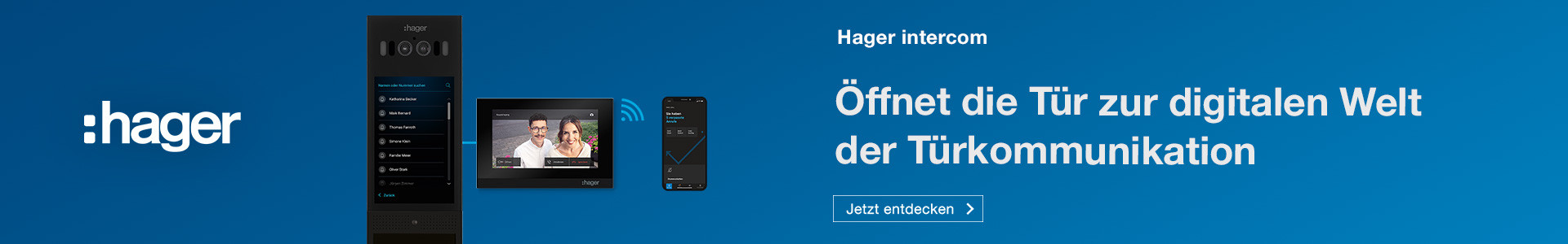 Das neue Türkommunikationssystem Hager intercom ist die Lösung für die digitale Zukunft. Es ist gleichermaßen für Neubau und Renovierung geeignet – nach außen CAT-verdrahtet und innen nutzt es 2Draht. Durch das digitale System können bis zu 1.000 Wohneinheiten ausgestattet werden. Dabei kann jede Wohneinheit mit Video-Innenstation die Hager intercom App für mehr Sicherheit und Komfort nutzen.